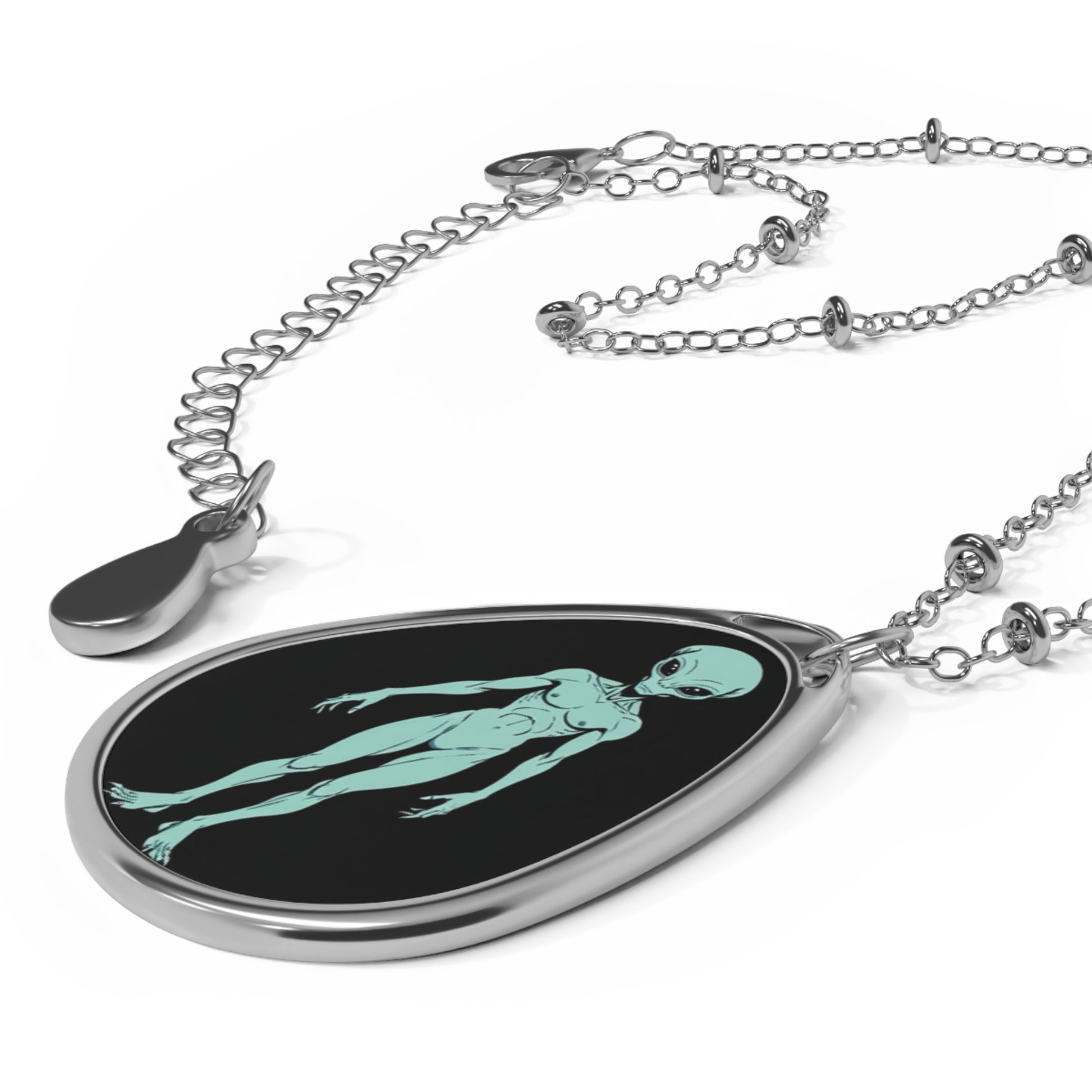A sleek oval necklace that reads like a tiny, personal talisman. The glossy, full-color pendant holds a crisp print on a white aluminum surface—here shown with a quiet, otherworldly alien figure set against deep black. Lightweight zinc alloy and a delicate chain with small bead accents let the pendant rest close to the collarbone, catching light and conversation. The lobster clasp keeps it secure for everyday wear, while the elongated oval silhouette gives the piece a slightly vintage-meets-modern feel. Wear it when you want an understated statement: mysterious, playful, and a little bit cosmic.