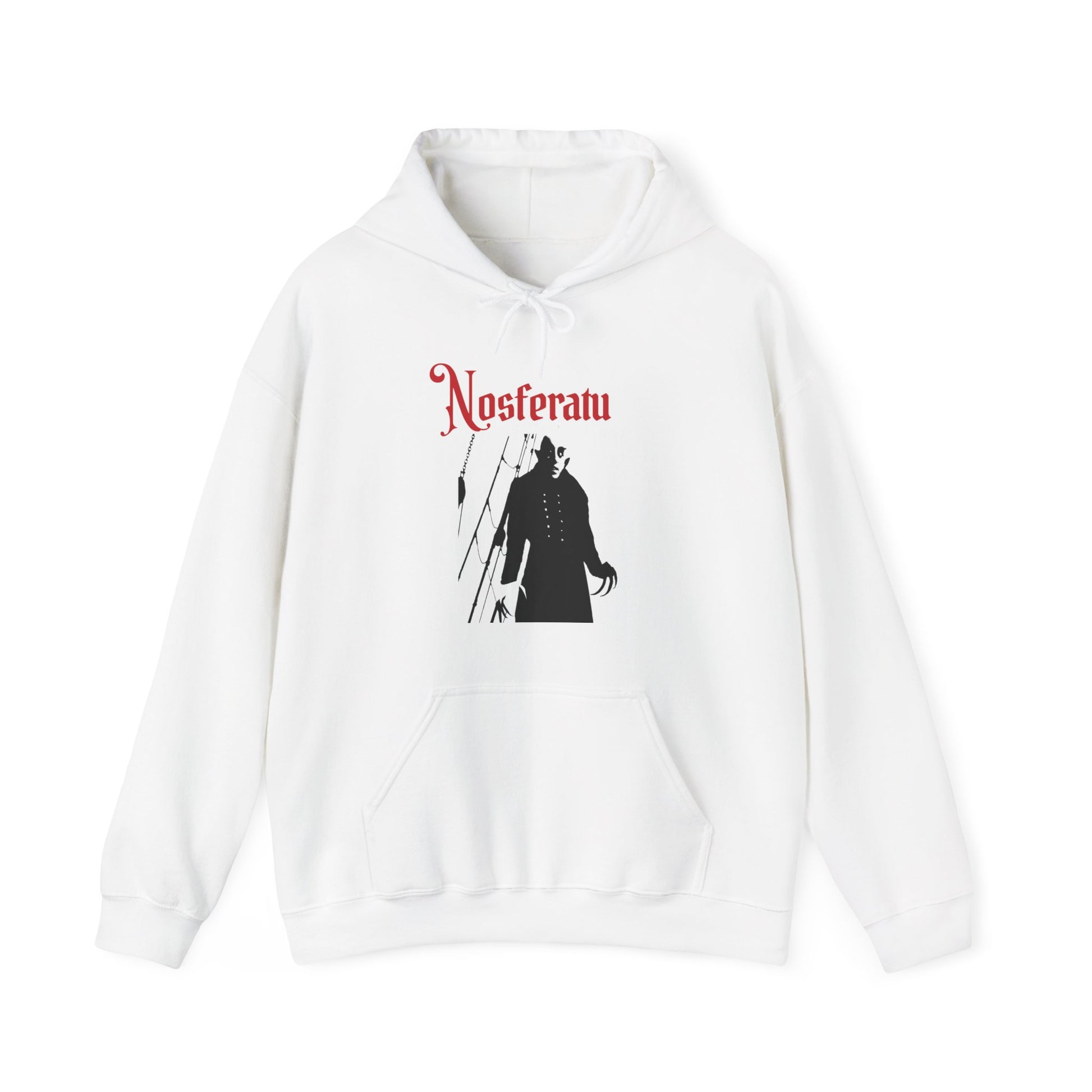 Slip into a quiet, cinematic chill with this Nosferatu hoodie — soft, warm, and built to linger in the half-light of late-night walks or spooky movie marathons. The stark silhouette of the silent vampire and the vintage red masthead feel like a faded film poster you found in an attic. It wears like a warm memory: roomy pouch for cold hands, double-lined hood that stakes out a cozy retreat, and a classic fit that sits comfortable over layers. For anyone who loves old horror, midnight storytelling, and slow-brewed coffee, this hooded sweatshirt becomes the garment you reach for when the evening leans toward mystery.
