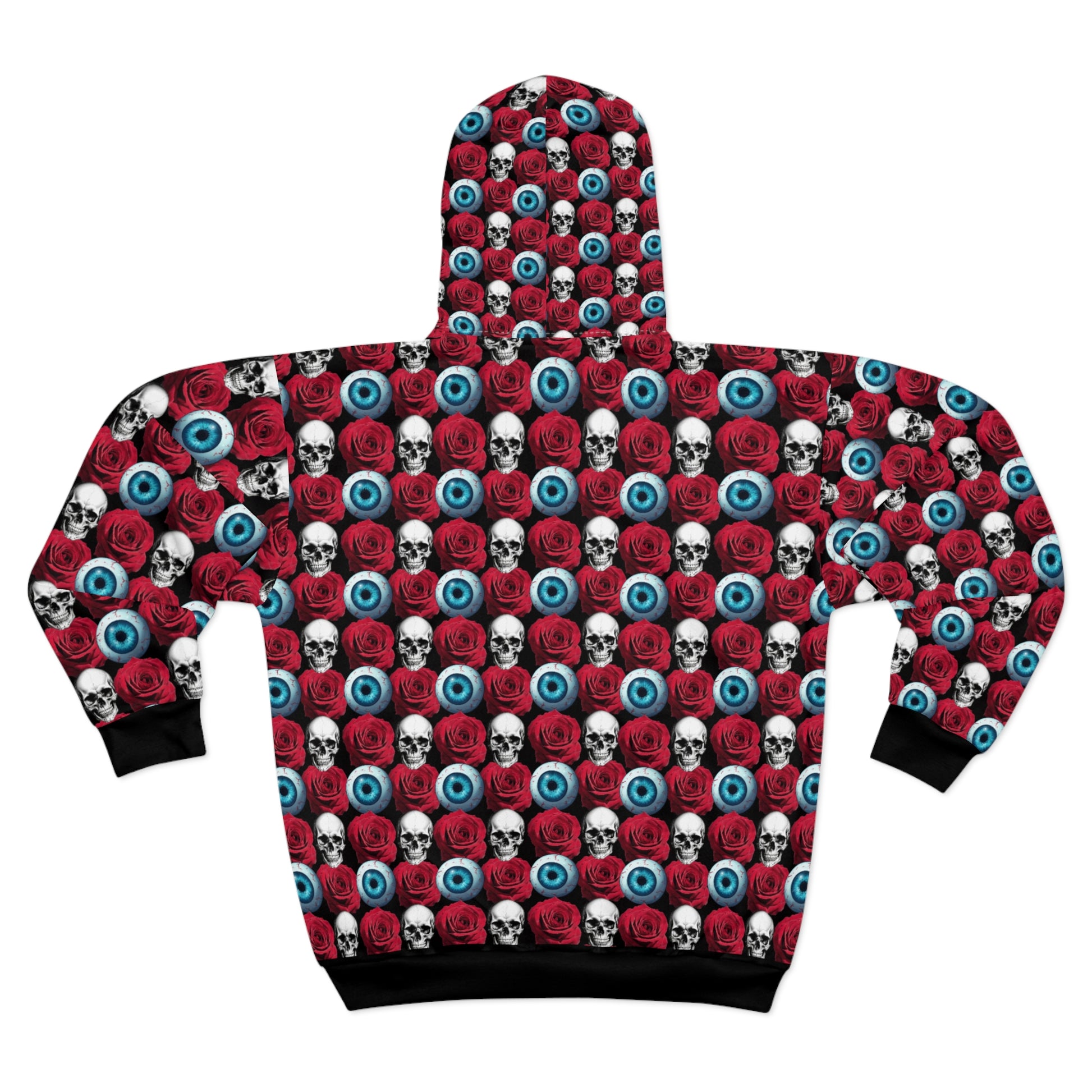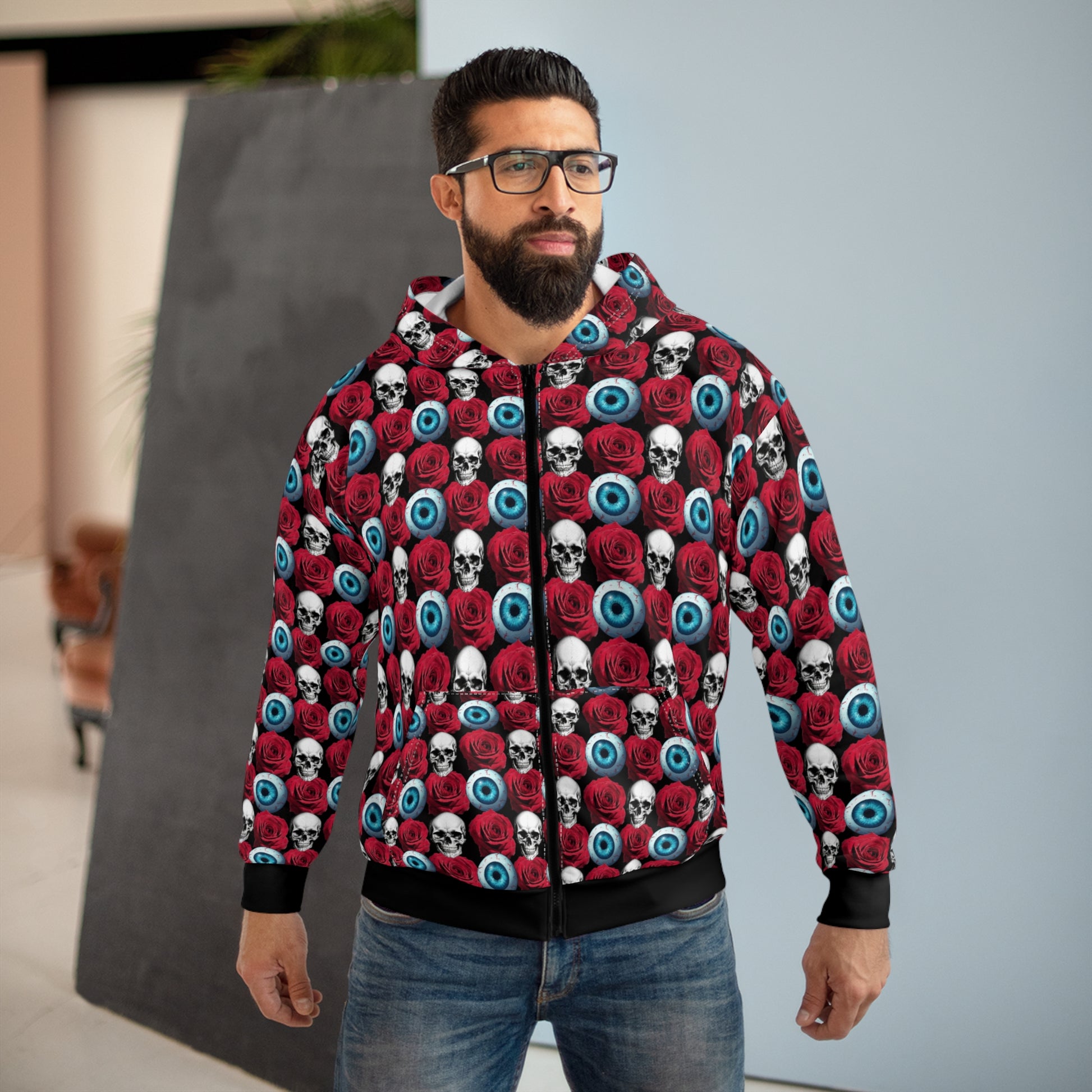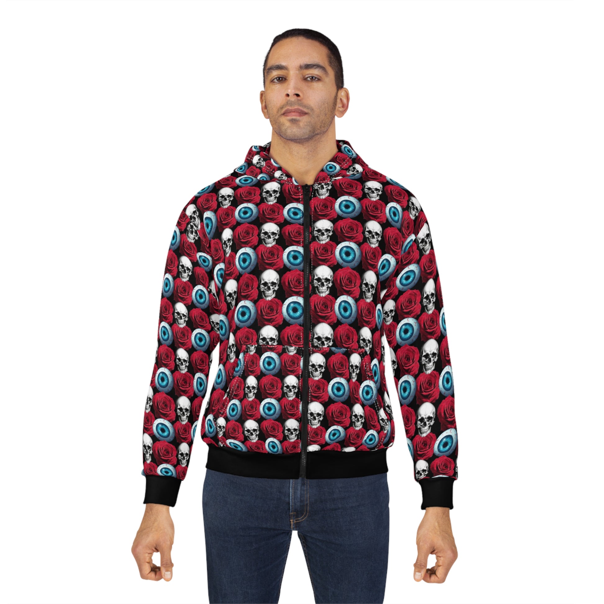 Slide into this all-over print zip hoodie and carry a bold, slightly macabre vibe wherever you go. The seamless pattern of skulls, red roses and bright blue eyeballs wraps the entire garment, so the design reads as a single striking statement from hood to hem. It feels substantial but breathable — a medium-weight fabric that keeps its shape and dries fast. Front pockets tuck your hands or small essentials away, and the full-zip lets you wear it layered over band tees or cozy sweaters. This hoodie works for late-night walks, rainy concert runs, or whenever you want to lean into a darkly whimsical aesthetic and stand out among the crowd.